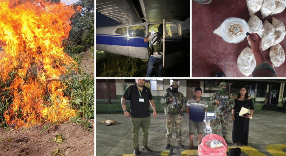Entre los principales resultados, destacó la erradicación de tres plantaciones de marihuana en Chuquisaca, con un total de 5.544 kg en estado natural destruidos. En el Chapare, se incautaron 54,18 kg de cocaína base en distintos operativos, además de 1.550 kg de sustancias químicas controladas. También se reportaron dos personas aprehendidas, el secuestro de tres inmuebles, cinco vehículos y el aseguramiento de una aeronave en Santa Cruz.