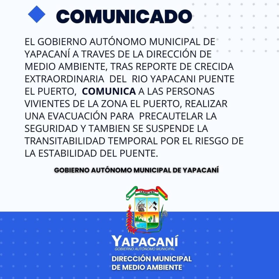 Santa Cruz, 17 nov de 2025 (RED DTV).–El Gobierno Autónomo Municipal de Yapacaní, a través de la Dirección de Medio Ambiente, informó que debido a la crecida extraordinaria del río Yapacaní en el sector del puente El Puerto, se ordenó la evacuación de los vecinos de la zona para precautelar su seguridad. Asimismo, se suspendió temporalmente la transitabilidad por el puente ante el riesgo de pérdida de estabilidad.