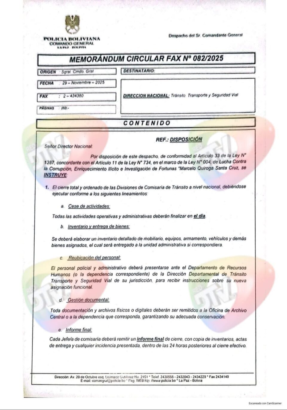 La Paz, 29 de noviembre 2025.- La Policía Boliviana ordenó el cierre inmediato de todas las Divisiones de Comisaría de Tránsito del país, según un memorándum firmado por el comandante general Mirko Sokol. La instrucción dispone suspender toda actividad y elaborar inventarios de equipos y vehículos.
