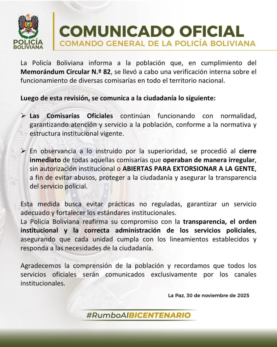 La Paz, 30 de noviembre 2025.- La Policía Boliviana informó que, tras una verificación interna basada en el Memorandum Circular N.º 82, se procedió a revisar el funcionamiento de las comisarías en todo el país. “Las Comisarías Oficiales continúan funcionando con normalidad, garantizando atención y servicio a la población, conforme a la normativa y estructura institucional vigente”, indicó el comunicado oficial.