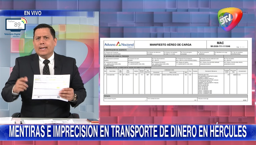Bolivia, 2 marzo 2026 (RED DTV).- La Red DTV accedió a documentación de la póliza aduanera. El Gobierno dice que son 78 millones de billetes que iban en avión Hércules siniestrado en El Alto. Pero multiplicado, restado, o sumado, no cuadra.