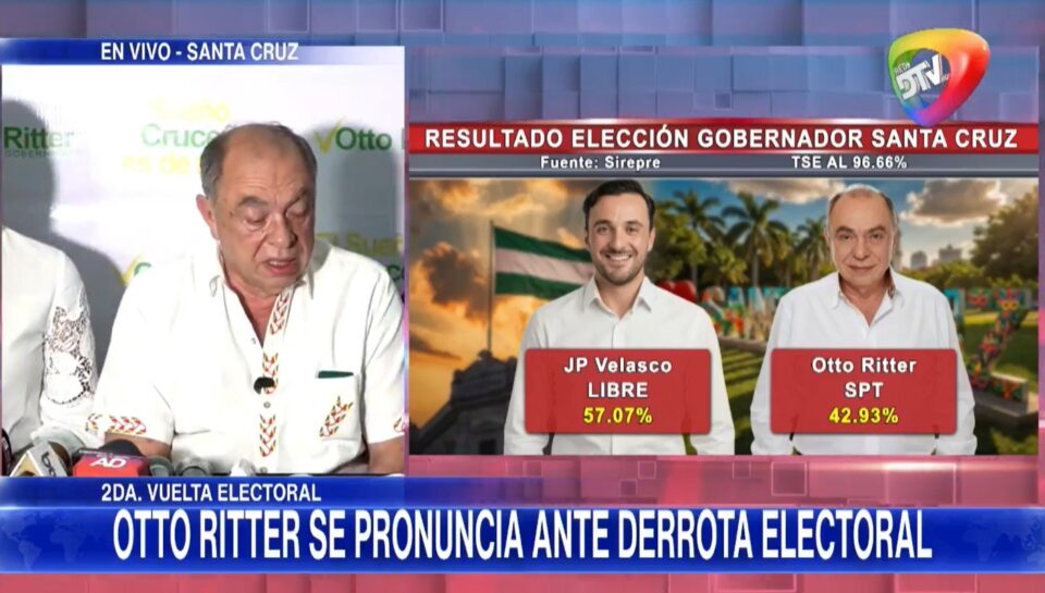 SCZ, 19 abr 2026. (RED DTV).- Tras perder en el histórico balotaje departamental frente a Juan Pablo Velasco, Otto Ritter reconoció la decisión popular, agradeció el respaldo recibido durante la campaña y aseguró que asumirá un rol activo de fiscalización, advirtiendo sobre el riesgo de un “tremendo fracaso” si no se cumplen las promesas.