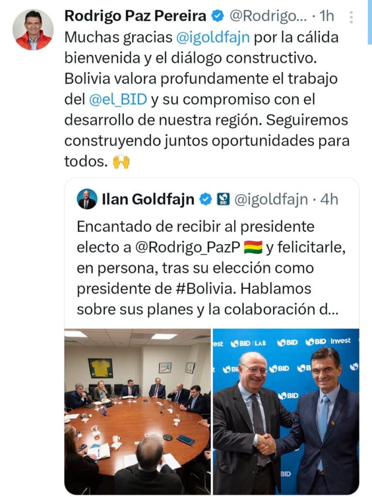 La Paz, 31 de oct de 2025 (RED DTV).– El presidente electo de Bolivia, Rodrigo Paz, expresó su agradecimiento a Ilan Goldfajn y al Banco Interamericano de Desarrollo (BID) tras un encuentro en Estados Unidos, destacando la “cálida bienvenida y el diálogo constructivo” y reafirmando el compromiso de trabajar juntos para generar oportunidades de desarrollo en el país y la región.