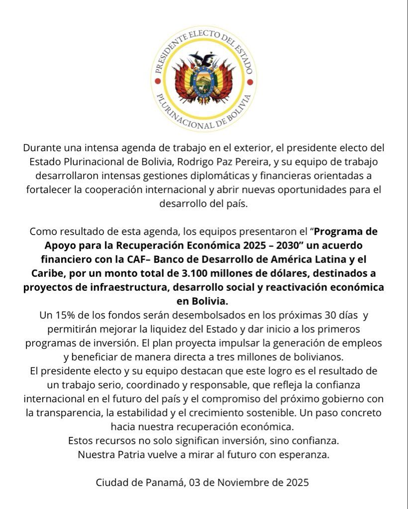 La Paz, 03 de nov de 2025 (RED DTV).–Durante su agenda internacional, el presidente electo de Bolivia, Rodrigo Paz Pereira, concretó un acuerdo financiero con la CAF–Banco de Desarrollo de América Latina y el Caribe por un monto de 3.100 millones de dólares. Los recursos serán destinados a proyectos de infraestructura, desarrollo social y reactivación económica en el país.