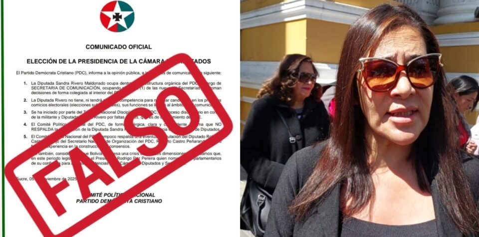 La Paz, 06 de nov de 2025 (RED DTV).–La diputada del Partido Demócrata Cristiano (PDC), Sandra Rivero, emitió un comunicado en el que denuncia la circulación de información que sería falsa que busca descalificar su trabajo en la Cámara de Diputados.