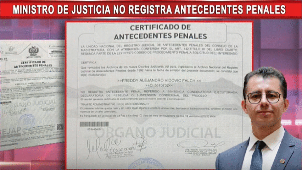 La Paz, 10 de nov 2025 (RED DTV).- El ministro de Justicia, don Freddy Vidovic, fue posesionado y juramentado en el cargo por Rodrigo Paz. Sin embargo, Vidovic fue sentenciado a tres años de cárcel, según consta en documentos judiciales. Más allá del certificado del REJAP (Registro Judicial de Antecedentes Penales), se intenta desconocer una sentencia que, aunque no se encuentre ejecutoriada, sí existe.