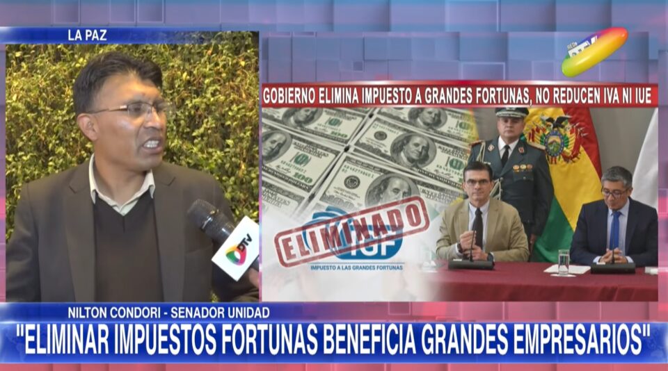 La Paz, 25 nov de 2025 (RED DTV).–El senador de Unidad, Nilton Condori, afirmó este martes que la abrogación del impuesto a las grandes fortunas será evaluada en la Asamblea Legislativa, aunque evitó adelantar criterio sobre presuntos beneficiarios particulares.