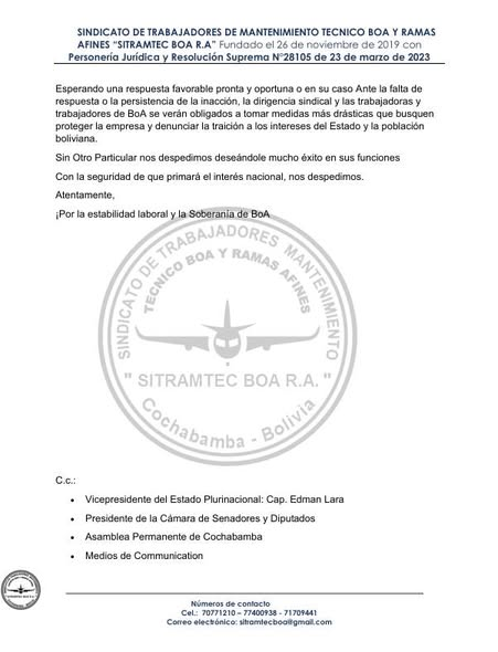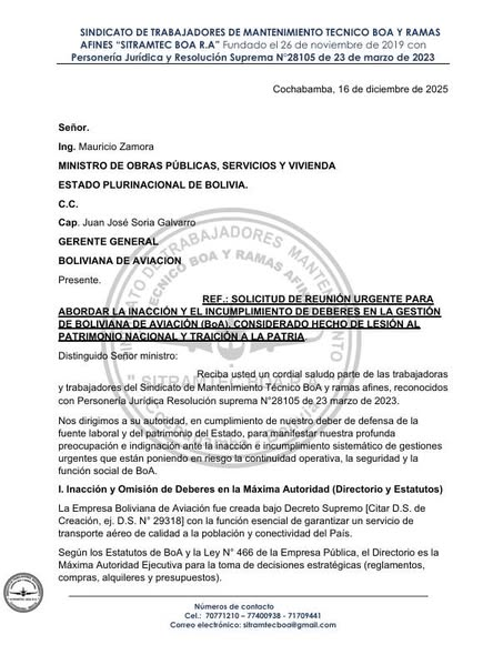 Bolivia, 17 dic 2025 (RED DTV).- El Sindicato de Trabajadores de Mantenimiento Técnico de Boliviana de Aviación (SITRAMTEC BoA R.A.) solicitó una reunión urgente al ministro de Obras Públicas, Mauricio Zamora, para abordar lo que califican como inacción e incumplimiento de deberes en la gestión de BoA, situación que —advierten— estaría afectando la continuidad operativa, la seguridad aeronáutica y el patrimonio del Estado. La nota fue remitida también al gerente general de la aerolínea estatal.