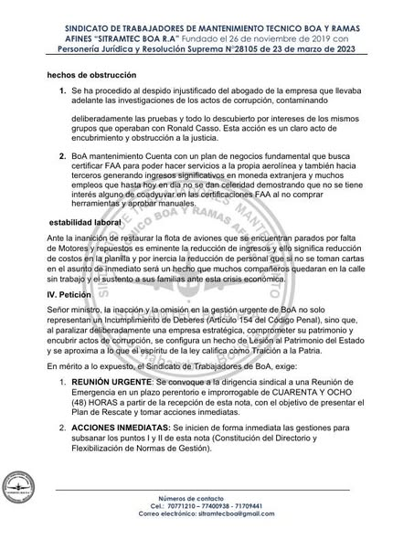 El documento alerta además sobre un déficit operativo creciente, detallando que existen cinco aviones parados por falta de motores y repuestos, así como diez motores pendientes de reparación en talleres internacionales, todos generando costos mensuales de alquiler sin producir ingresos. A ello se suma la denuncia de presuntos hechos de corrupción en investigación y de obstrucción a la justicia, incluyendo el despido del abogado que llevaba procesos vinculados a estos casos y la falta de avance en un plan para certificar mantenimiento bajo normas FAA.