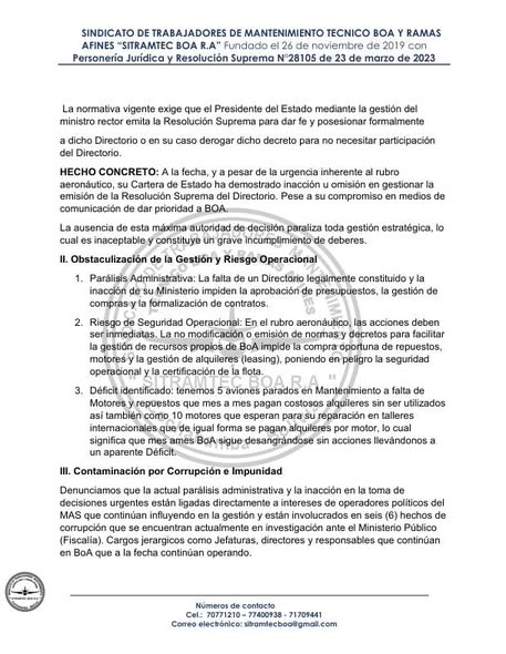 Según el sindicato, la falta de conformación legal del Directorio de BoA, responsabilidad que atribuyen a la cartera ministerial, ha paralizado decisiones estratégicas clave como presupuestos, compras, alquileres y contratos. Esta omisión, señalan, impide responder con rapidez a las necesidades del rubro aeronáutico y agrava el riesgo operacional, al no poder adquirir repuestos, motores ni gestionar alquileres (leasing) de manera oportuna.