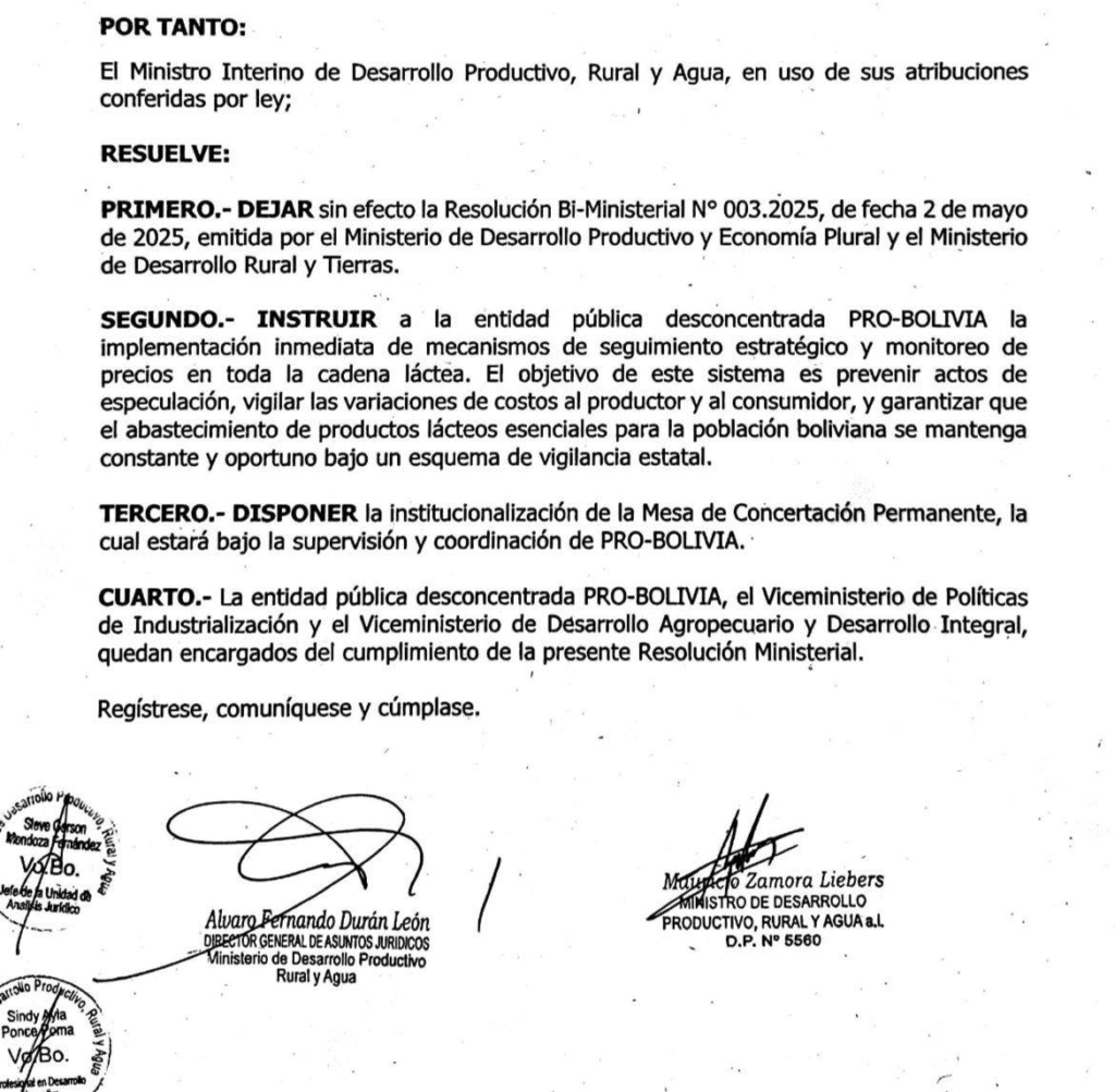 El Gobierno desreguló el precio de la leche mediante una resolución firmada por el ministro Mauricio Zamora en reemplazo del ministro Oscar Mario Justiniano.