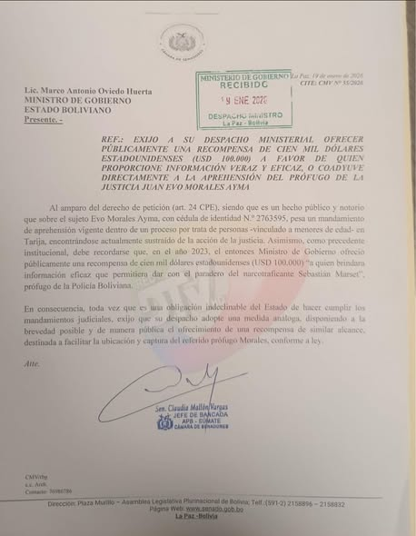 Bolivia, 21 ene 2026 (RED DTV).-La jefa de bancada de Súmate, Claudia Mallon, envió una solicitud al ministro de Gobierno para que ofrezca una recompensa de 100 mil dólares con el fin de dar con el paradero de Evo Morales.