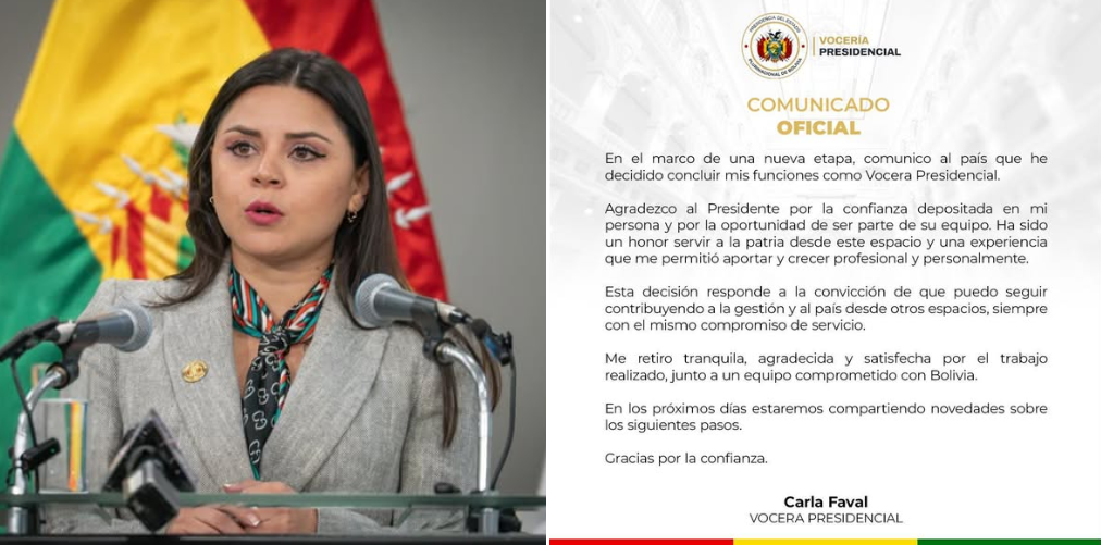 Bolivia, 17 marzo 2026 (RED DTV).- Carla Faval comunicó oficialmente su decisión de concluir sus funciones como vocera presidencial, marcando el cierre de su paso...