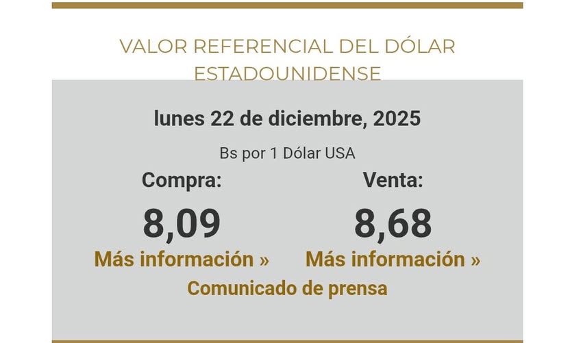 Bolivia, 22 dic 2025 (RED DTV).-El Banco Central de Bolivia (BCB) difundió en su página oficial el valor referencial del dólar estadounidense correspondiente a este...