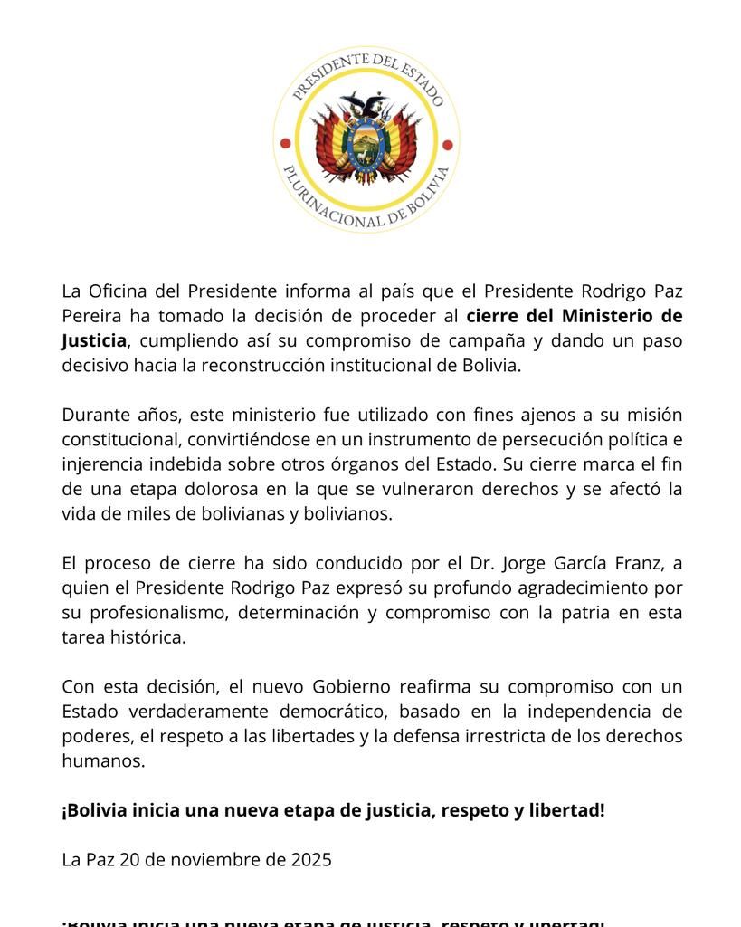 La Paz, 20 nov de 2025 (RED DTV).–En su duodécimo día de gestión, Rodrigo Paz afirmó que el Gobierno está “recuperando la institucionalidad que Bolivia...