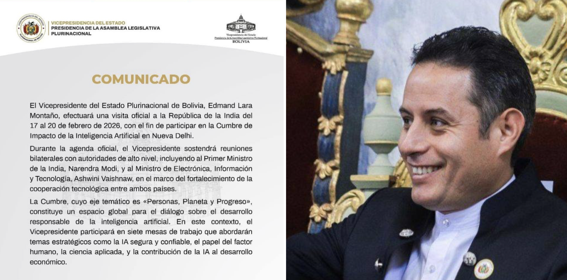 POLÍTICALara viajará a la India a una cumbre de Inteligencia ArtificialClaudia Cuarite15 de febrero de 202615 de febrero de 2026 15 de febrero de 202615 de febrero de 2026018 Bolivia, 15 feb 2026 (RED DTV).- Con un comunicado la Vicepresidencia del Estado Plurinacional de Bolivia confirmó que el vicepresidente Edmand Lara viajará a la...