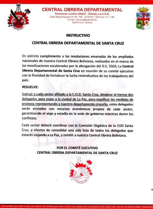 Bolivia, 29 dic 2025 (RED DTV).– La Central Obrera Departamental (COD) de Santa Cruz instruyó a todos sus sindicatos afiliados designar al menos dos delegados...