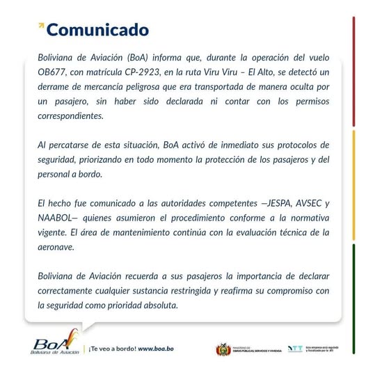 Bolivia, 15 dic 2025 (red DTV).- Boliviana de Aviación (BoA) reportó la detección de un derrame de mercancía peligrosa que era transportada de forma oculta...