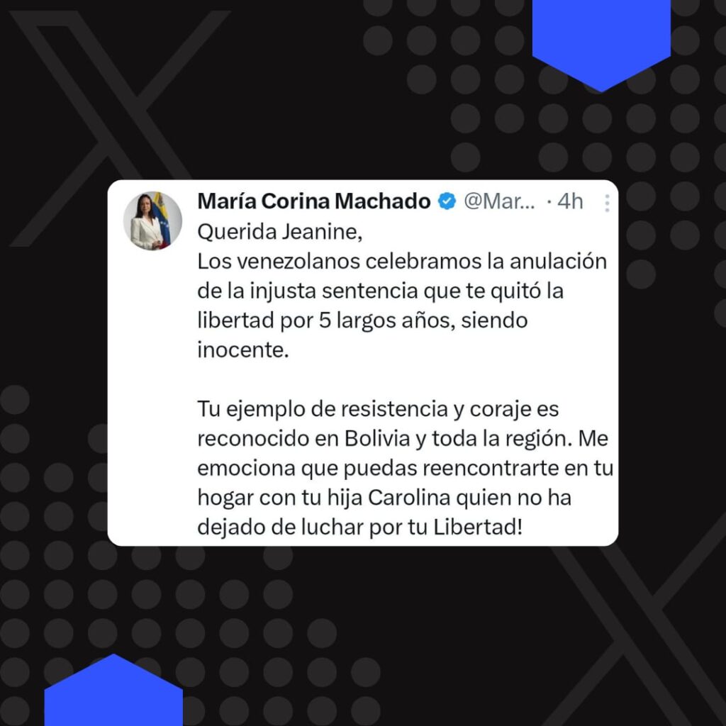 Venezuela, 05 de nov de 2025 (RED DTV).–La líder opositora venezolana y premio Nobel de la Paz, María Corina Machado, celebró la decisión del Tribunal Supremo de Justicia de Bolivia que anuló la condena contra la expresidenta Jeanine Áñez, señalando que se trató de una “injusta sentencia que te quitó la libertad por 5 largos años, siendo inocente”. Machado destacó “tu ejemplo de resistencia y coraje es reconocido en Bolivia y toda la región” y expresó su emoción porque Áñez pueda reencontrarse con su hija Carolina, quien no dejó de luchar por su libertad.