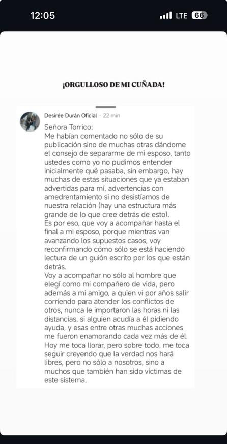 La publicación también responde a comentarios que le sugerían el divorcio. “Me habían comentado no sólo de su publicación sino de muchas otras dándome el consejo de separarme de mi esposo; tanto ustedes como yo no pudimos entender inicialmente qué pasaba; sin embargo, hay muchas de estas situaciones que ya estaban advertidas para mí, advertencias con amedrentamiento si no desistíamos de nuestra relación (hay una estructura más grande de lo que cree detrás de esto)”, afirma.