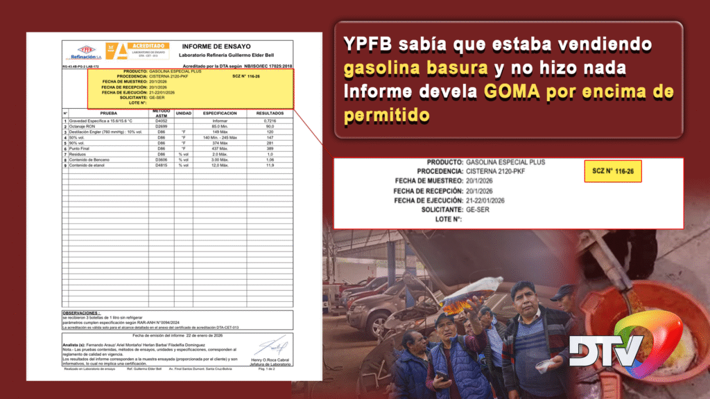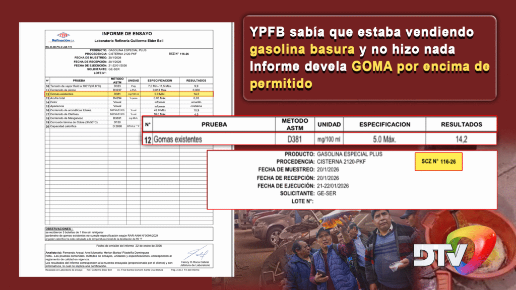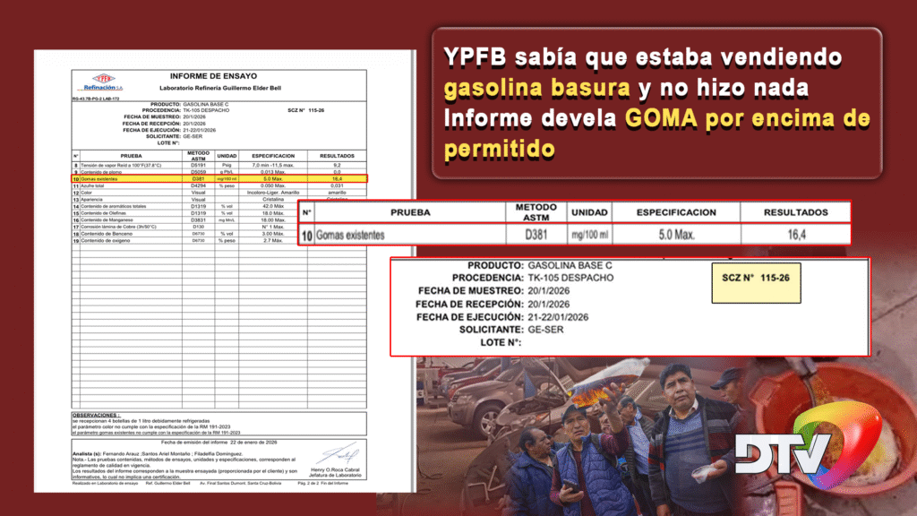 Bolivia, 26 feb 2026 (RED DTV).- TERRIBLE, GRAVE LO QUE OCURRE EN YPFB. Según documentación a la que accedió la RED DTV, dos de los tantos laboratorios que se realizaron a la gasolina que ha dañado gran parte del parque automotor de nuestro país, es decir, de Yacimientos Petrolíferos Fiscales Bolivianos. Sabían que lo que se estaba vendiendo era BASURA y NO LES IMPORTÓ.