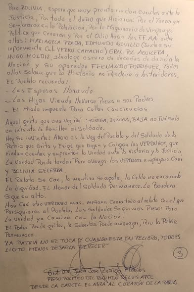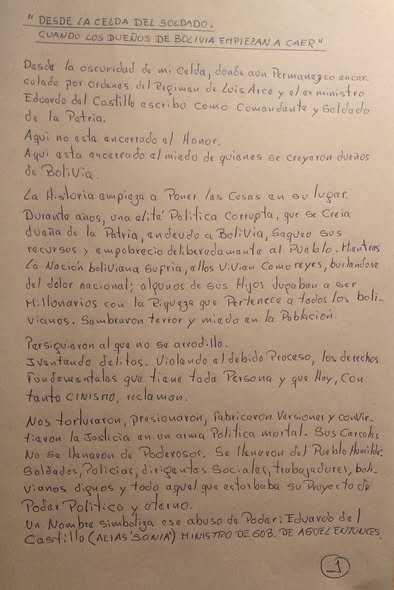 En su misiva, Zúñiga fue enfático al señalar: “No voy a mentirle al pueblo: sí, celebro de verdad y me alegra la caída y la detención de otro verdugo, quien tanto daño hizo a Bolivia. Y sí, le doy también la bienvenida a las ‘cárceles del pueblo’”. Asimismo, sostuvo que Del Castillo representa “un nombre que simboliza ese abuso de poder: Eduardo del Castillo (alias Sonia), ministro de Gobierno de aquel entonces (…)”, añadiendo que ahora “empieza a conocer la prisión que él usó contra el pueblo”.